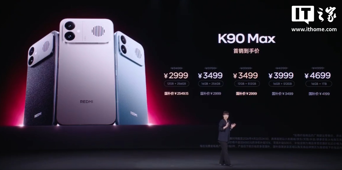 小米 REDMI K90 Max 4 月 21 日晚发布,是品牌首款内置风扇散热的手机,搭载天玑 9500 芯片,起售价 2999 元。卢伟冰在回应网友提问时坦言该机“亏损”。