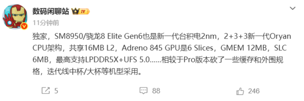 该平台在内存与存储支持上也有所升级,最高可支持LPDDR5X内存与UFS 5.0闪存标准。爆料信息同时指出,该芯片将作为迭代产品线中的“中杯”或“大杯”机型采用。相较于定位更高的“Pro”版本,其在缓存容量和部分外围规格上会有所精简。